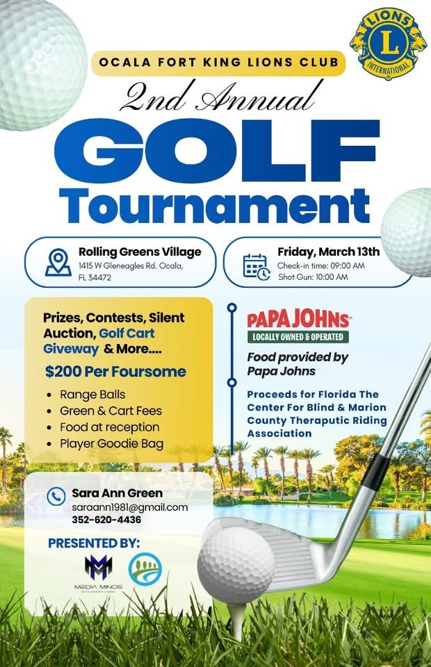The Ocala Fort King Lions Breakfast Club has been dedicated to helping meet the needs of the local community since its inception in 1963. All 100% of the funds raised go directly back into the community through needed services such as eye surgeries, exams and eyeglasses, guide dogs, and supporting the Florida Center for The Club.The Ocala Fort King Lions Breakfast Club meets every Wednesday morning, 8-8:30 AM Breakfast and 8:30-9:30 AM meeting at the West Clubhouse at the Rolling Greens Community. 2026 Pebble Beach RdOcala, FL 34472Visitors are always welcome!